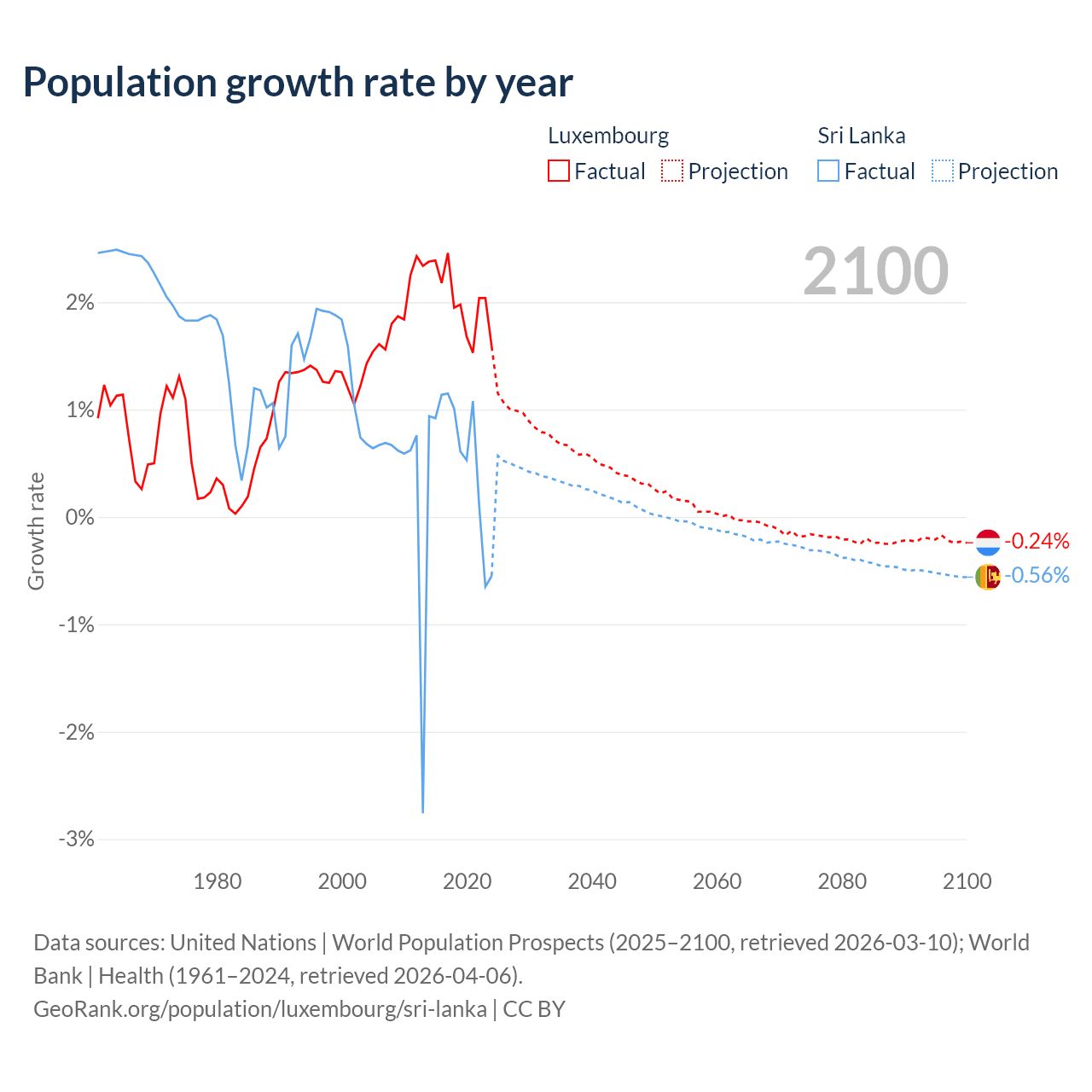 - For the last 10 years, Luxembourg has had an average growth rate of +2.02% per year vs +0.57% in Sri Lanka.