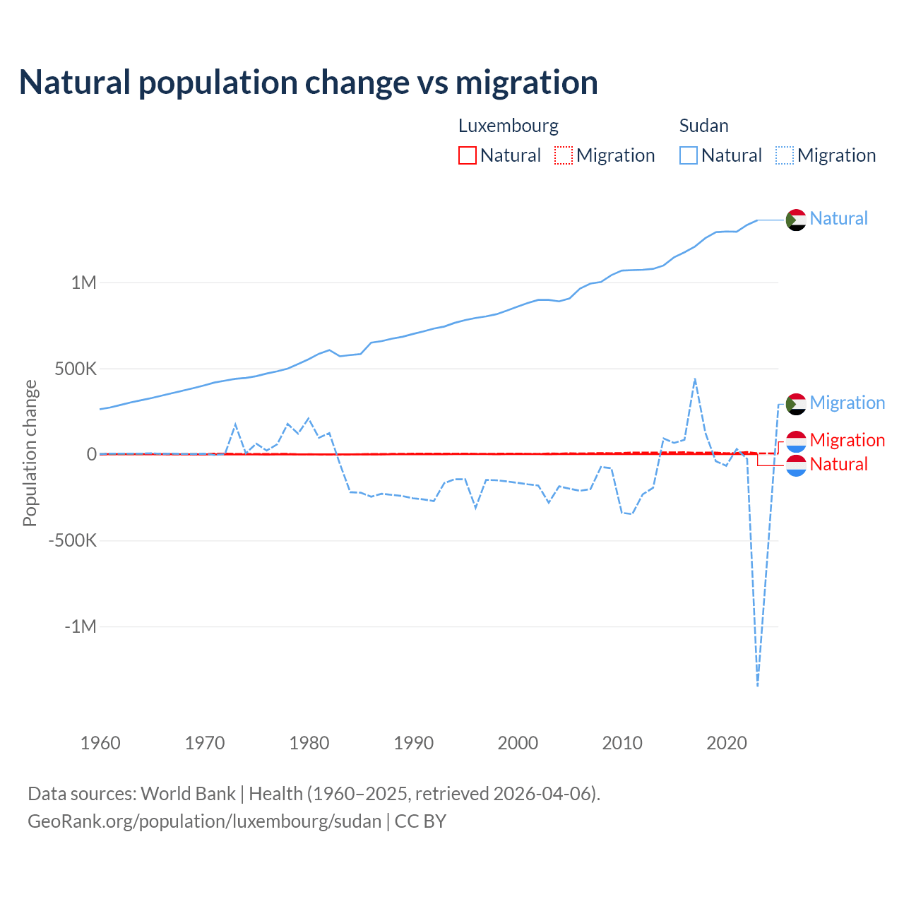 Over the last 10 years, 16.8% of the population change in Luxembourg is from natural causes (a gain of 20,287 people) and 83.2% is from migration (a gain of 100,435 people). In Sudan 95.1% is from natural causes (a gain of 12,459,977 people) and 4.88% is from migration (a loss of 639,596 people).