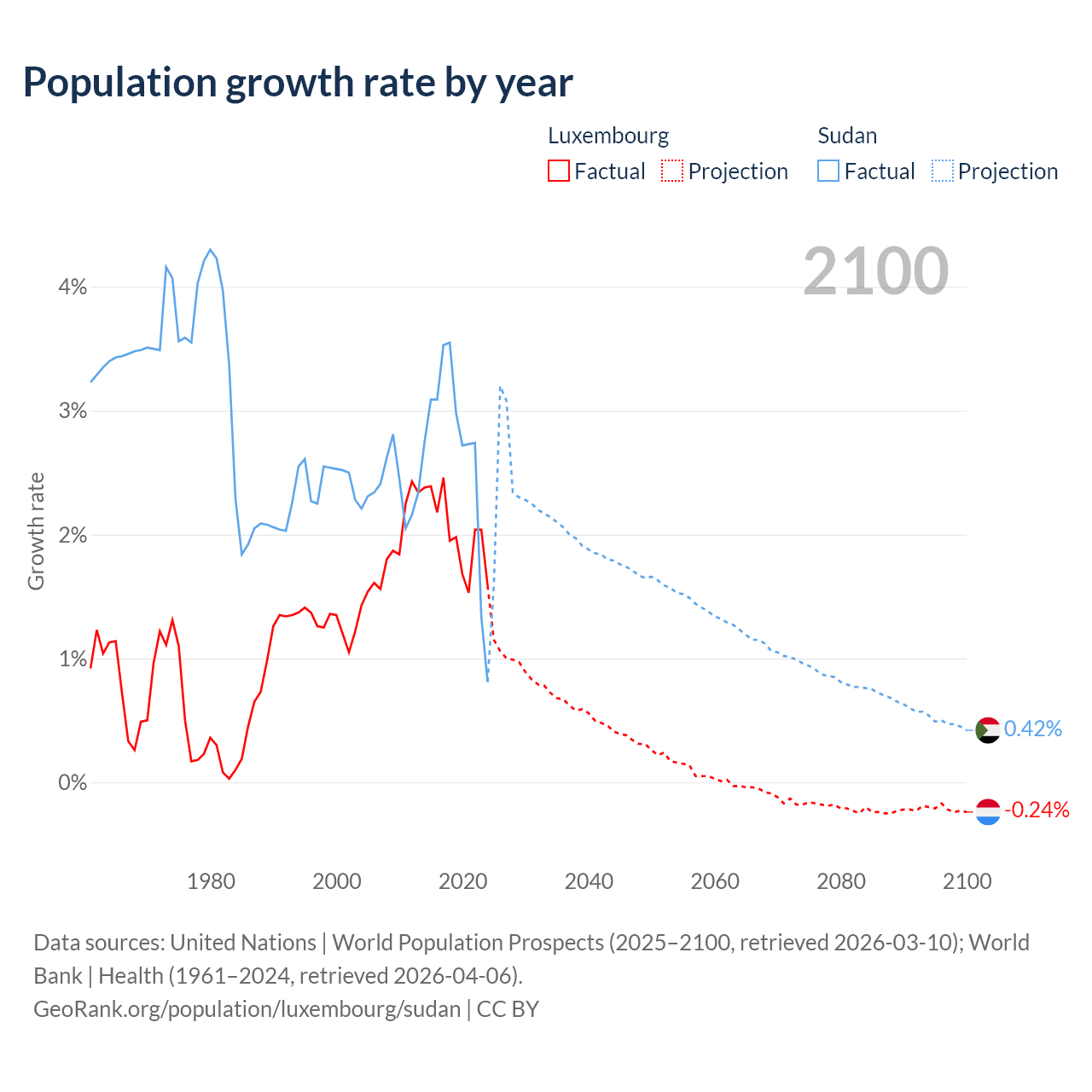- For the last 10 years, Luxembourg has had an average growth rate of +2.02% per year vs +2.67% in Sudan.