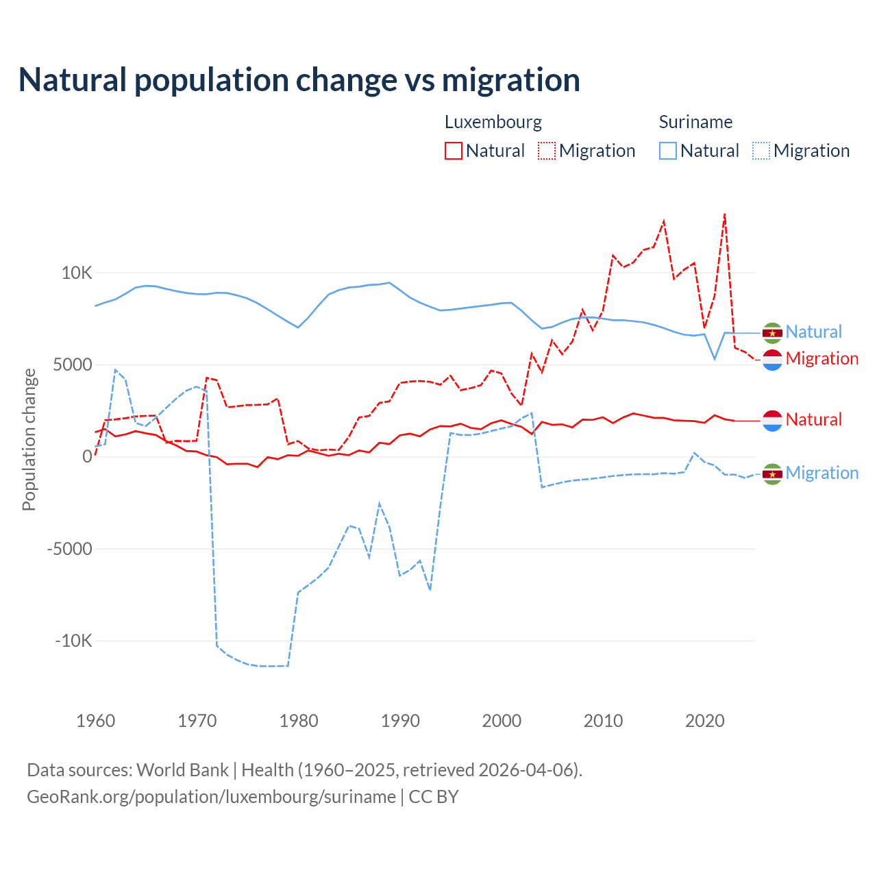 Over the last 10 years, 16.8% of the population change in Luxembourg is from natural causes (a gain of 20,287 people) and 83.2% is from migration (a gain of 100,435 people). In Suriname 90.3% is from natural causes (a gain of 66,709 people) and 9.72% is from migration (a loss of 7,185 people).
