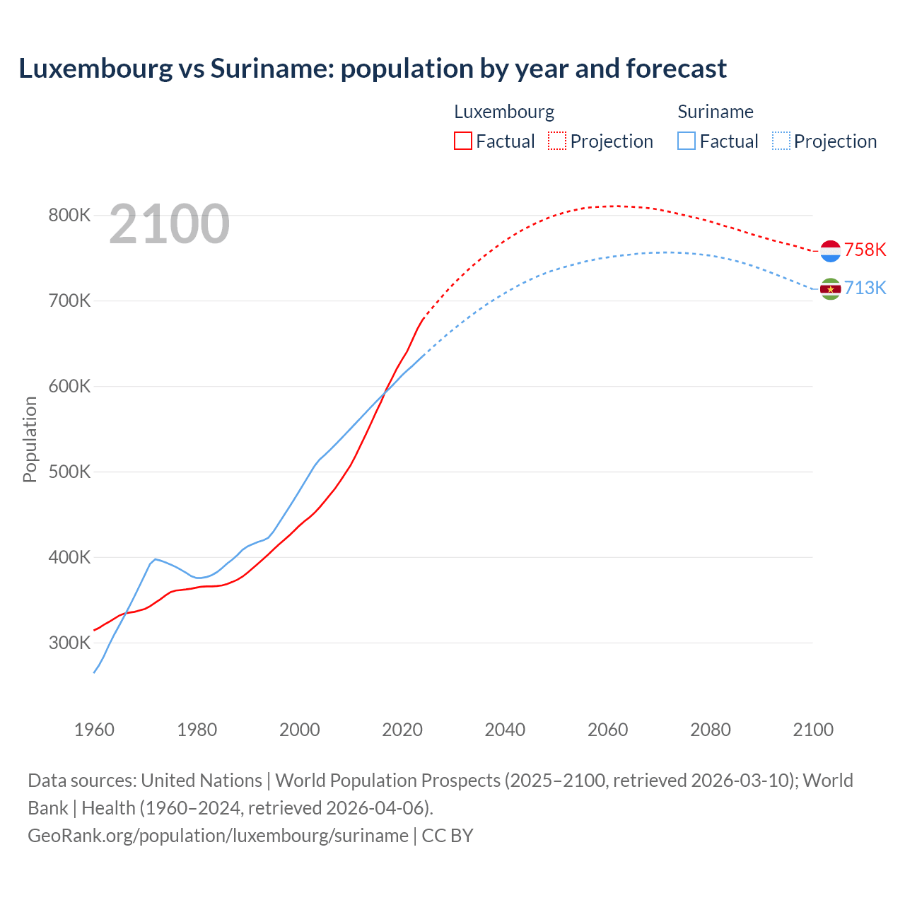 Luxembourg vs Suriname: population by year and forecast