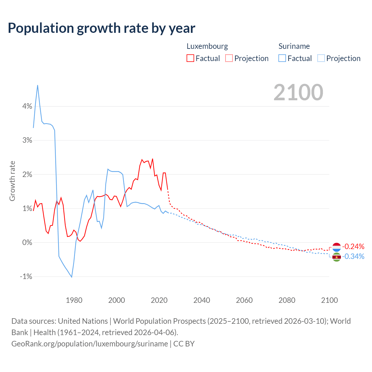 - For the last 10 years, Luxembourg has had an average growth rate of +2.02% per year vs +0.99% in Suriname.
