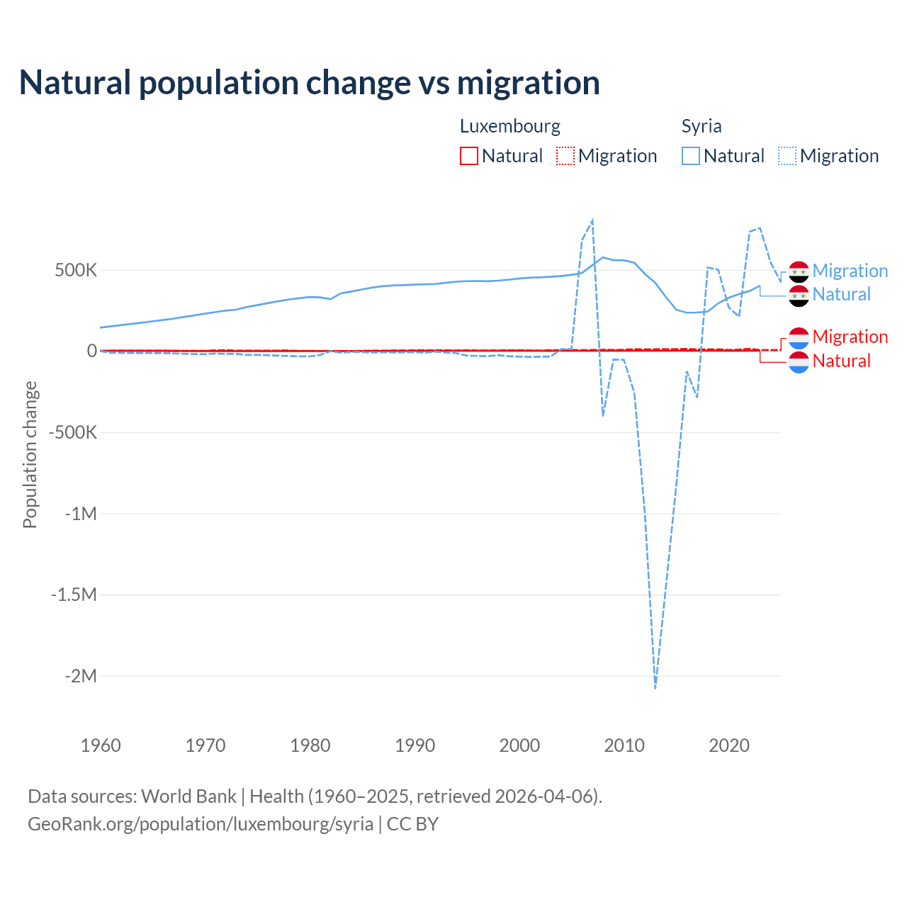 Over the last 10 years, 16.8% of the population change in Luxembourg is from natural causes (a gain of 20,287 people) and 83.2% is from migration (a gain of 100,435 people). In Syria 91.3% is from natural causes (a gain of 3,047,621 people) and 8.72% is from migration (a gain of 291,069 people).