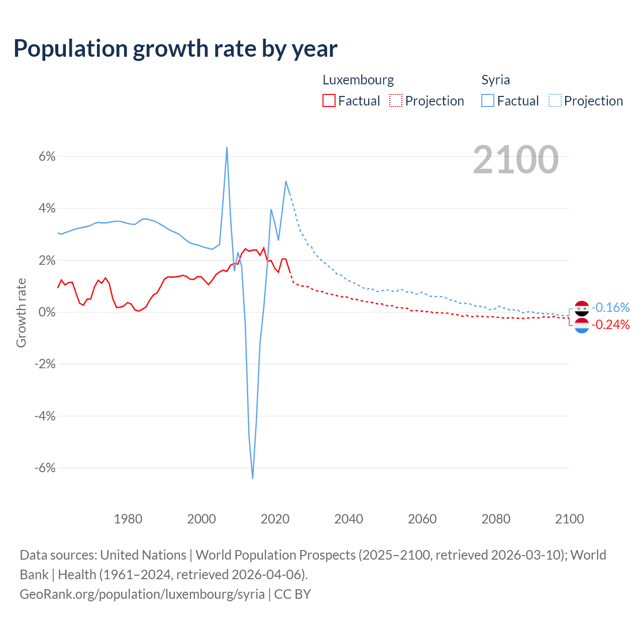 - For the last 10 years, Luxembourg has had an average growth rate of +2.02% per year vs +1.25% in Syria.