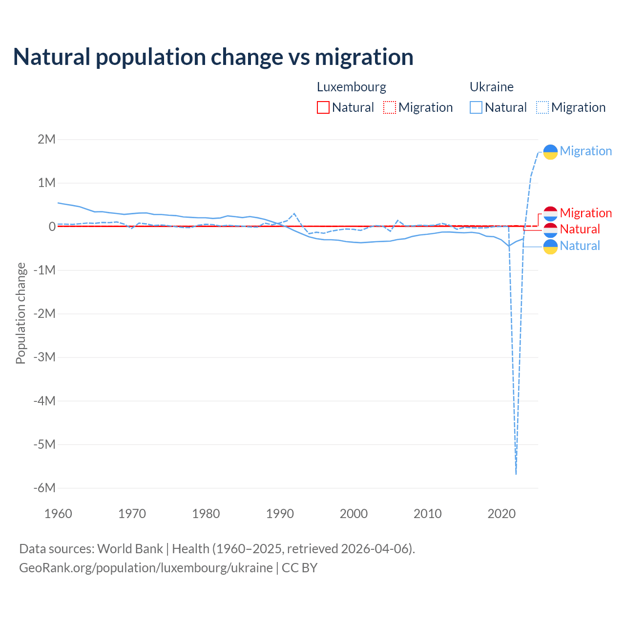 Over the last 10 years, 16.8% of the population change in Luxembourg is from natural causes (a gain of 20,287 people) and 83.2% is from migration (a gain of 100,435 people). In Ukraine 28.2% is from natural causes (a loss of 2,435,153 people) and 71.8% is from migration (a loss of 6,198,995 people).