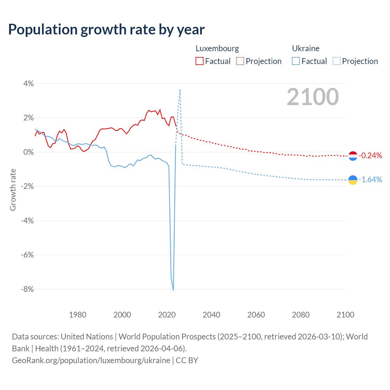 - For the last 10 years, Luxembourg has had an average growth rate of +2.02% per year vs -1.74% in Ukraine.