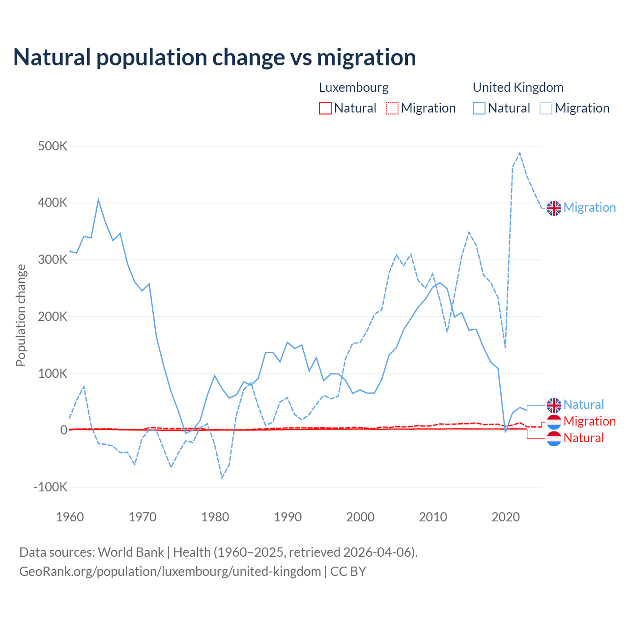 Over the last 10 years, 16.8% of the population change in Luxembourg is from natural causes (a gain of 20,287 people) and 83.2% is from migration (a gain of 100,435 people). In the United Kingdom 23.9% is from natural causes (a gain of 1,033,129 people) and 76.1% is from migration (a gain of 3,283,101 people).
