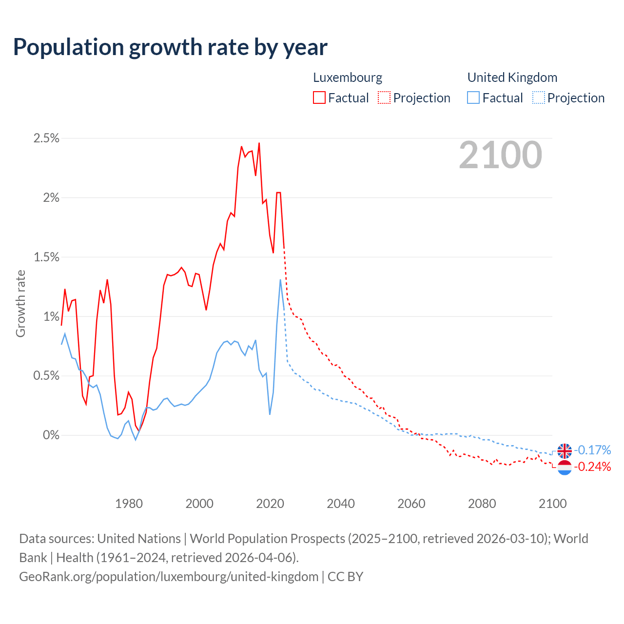- For the last 10 years, Luxembourg has had an average growth rate of +2.02% per year vs +0.7% in the United Kingdom.