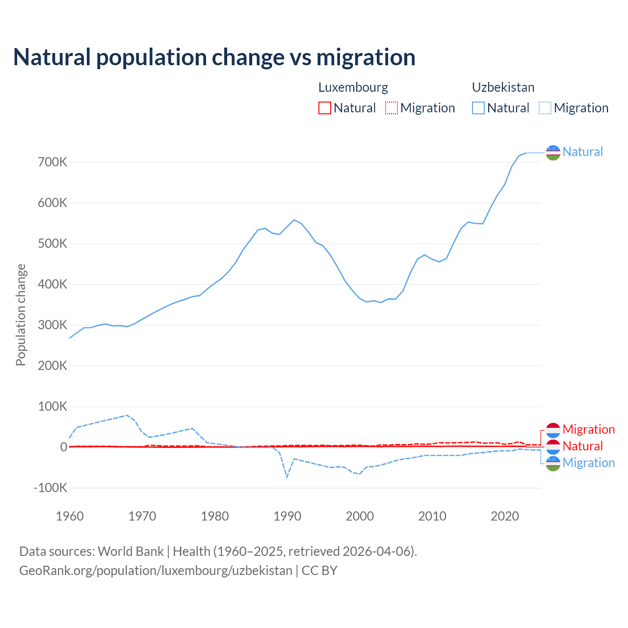 Over the last 10 years, 16.8% of the population change in Luxembourg is from natural causes (a gain of 20,287 people) and 83.2% is from migration (a gain of 100,435 people). In Uzbekistan 98.2% is from natural causes (a gain of 6,161,117 people) and 1.84% is from migration (a loss of 115,398 people).