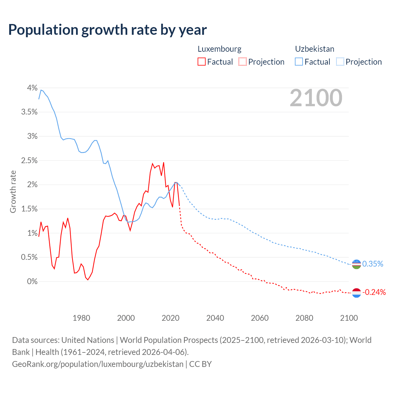 - For the last 10 years, Luxembourg has had an average growth rate of +2.02% per year vs +1.85% in Uzbekistan.