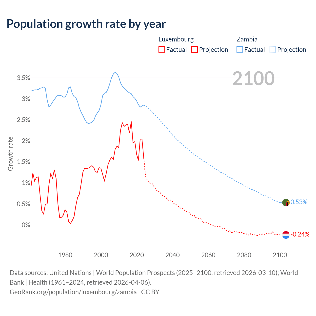 - For the last 10 years, Luxembourg has had an average growth rate of +2.02% per year vs +3% in Zambia.