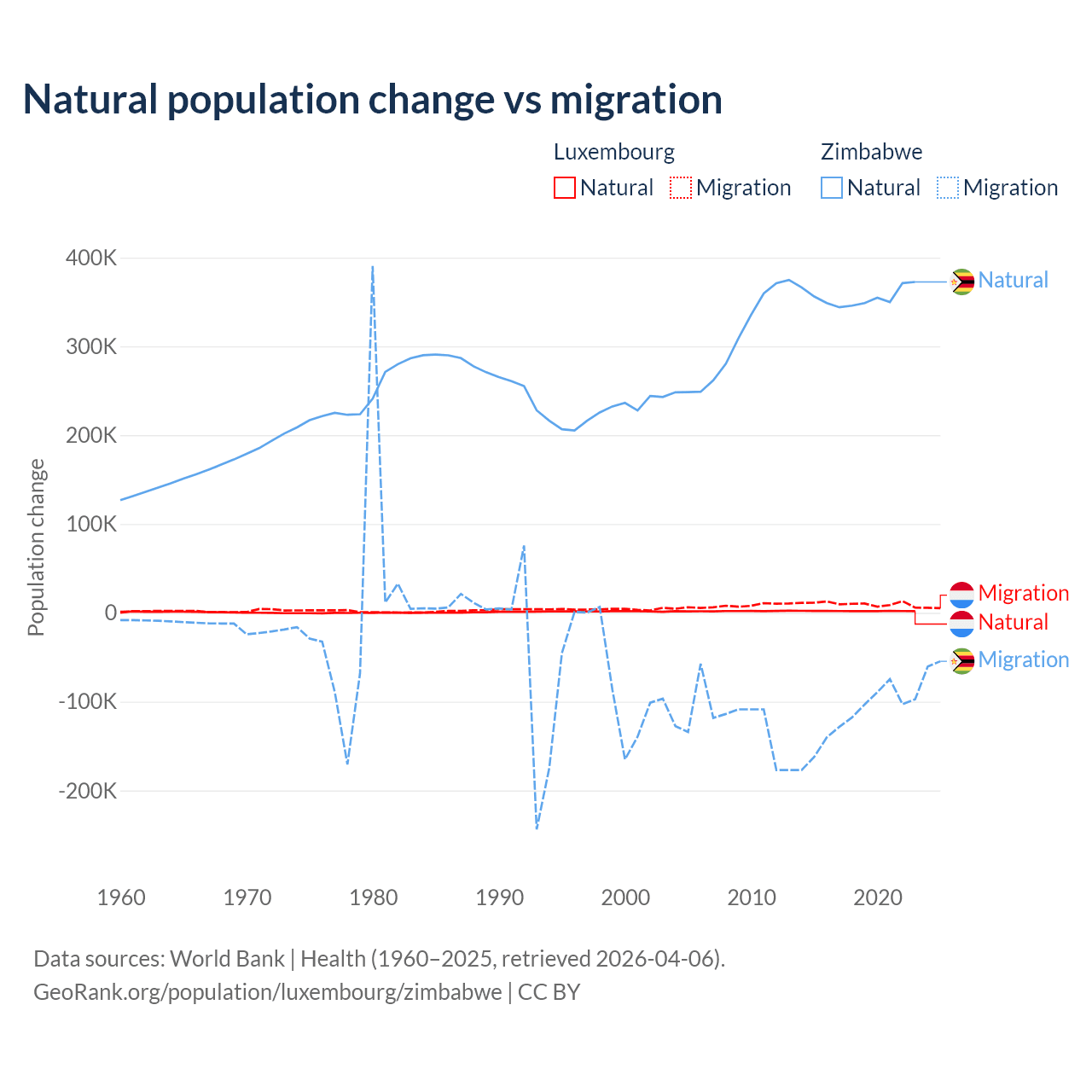 Over the last 10 years, 16.8% of the population change in Luxembourg is from natural causes (a gain of 20,287 people) and 83.2% is from migration (a gain of 100,435 people). In Zimbabwe 74.9% is from natural causes (a gain of 3,558,487 people) and 25.1% is from migration (a loss of 1,192,807 people).