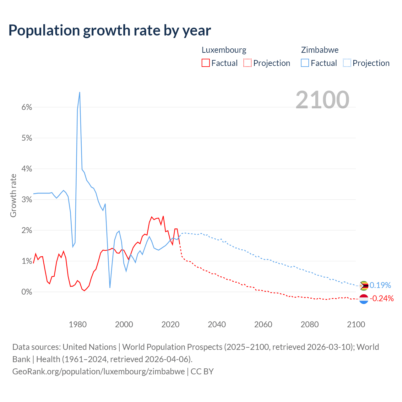 - For the last 10 years, Luxembourg has had an average growth rate of +2.02% per year vs +1.57% in Zimbabwe.