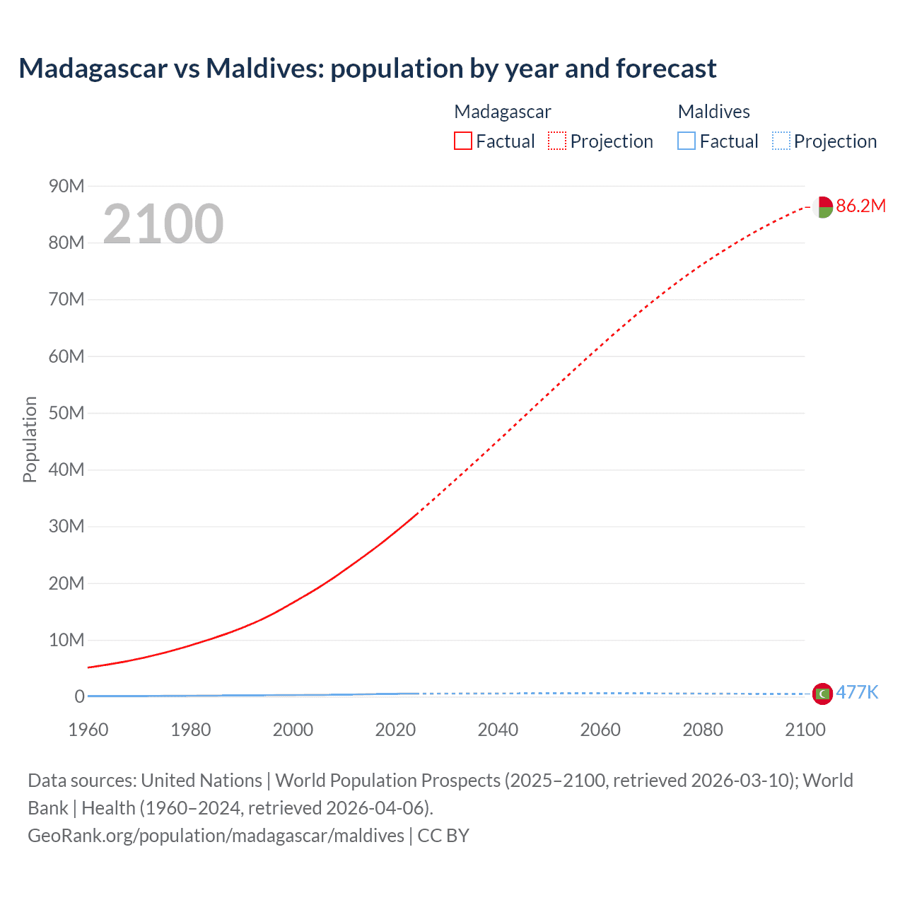 Madagascar vs Maldives: population by year and forecast