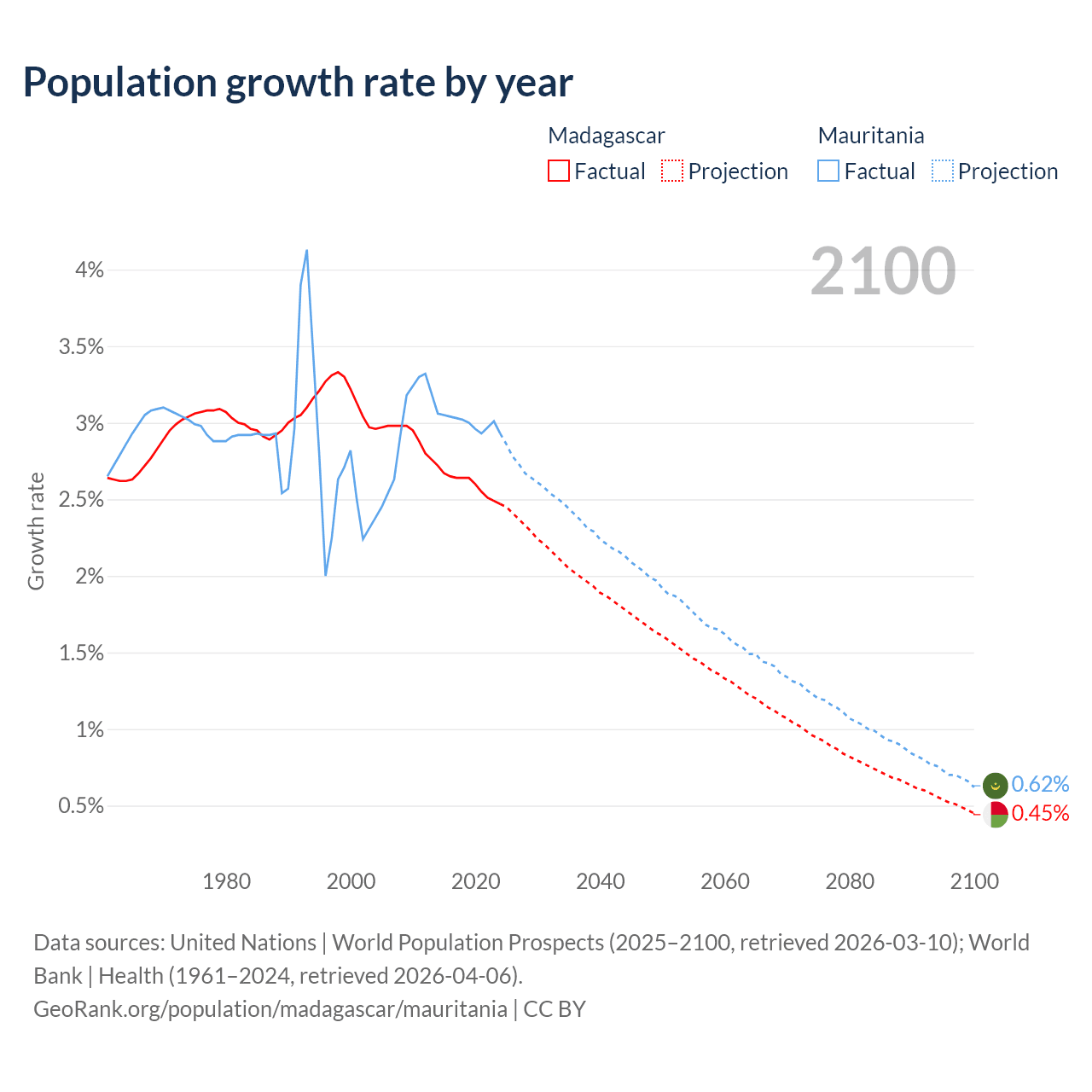 - For the last 10 years, Madagascar has had an average growth rate of +2.6% per year vs +3% in Mauritania.