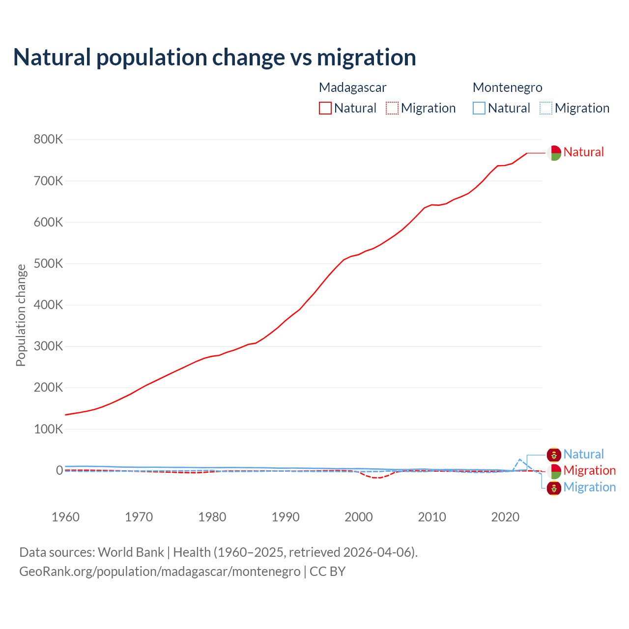 Over the last 10 years, 99.7% of the population change in Madagascar is from natural causes (a gain of 7,165,578 people) and 0.31% is from migration (a loss of 22,384 people). In Montenegro 52.4% is from natural causes (a gain of 4,501 people) and 47.6% is from migration (a gain of 4,095 people).