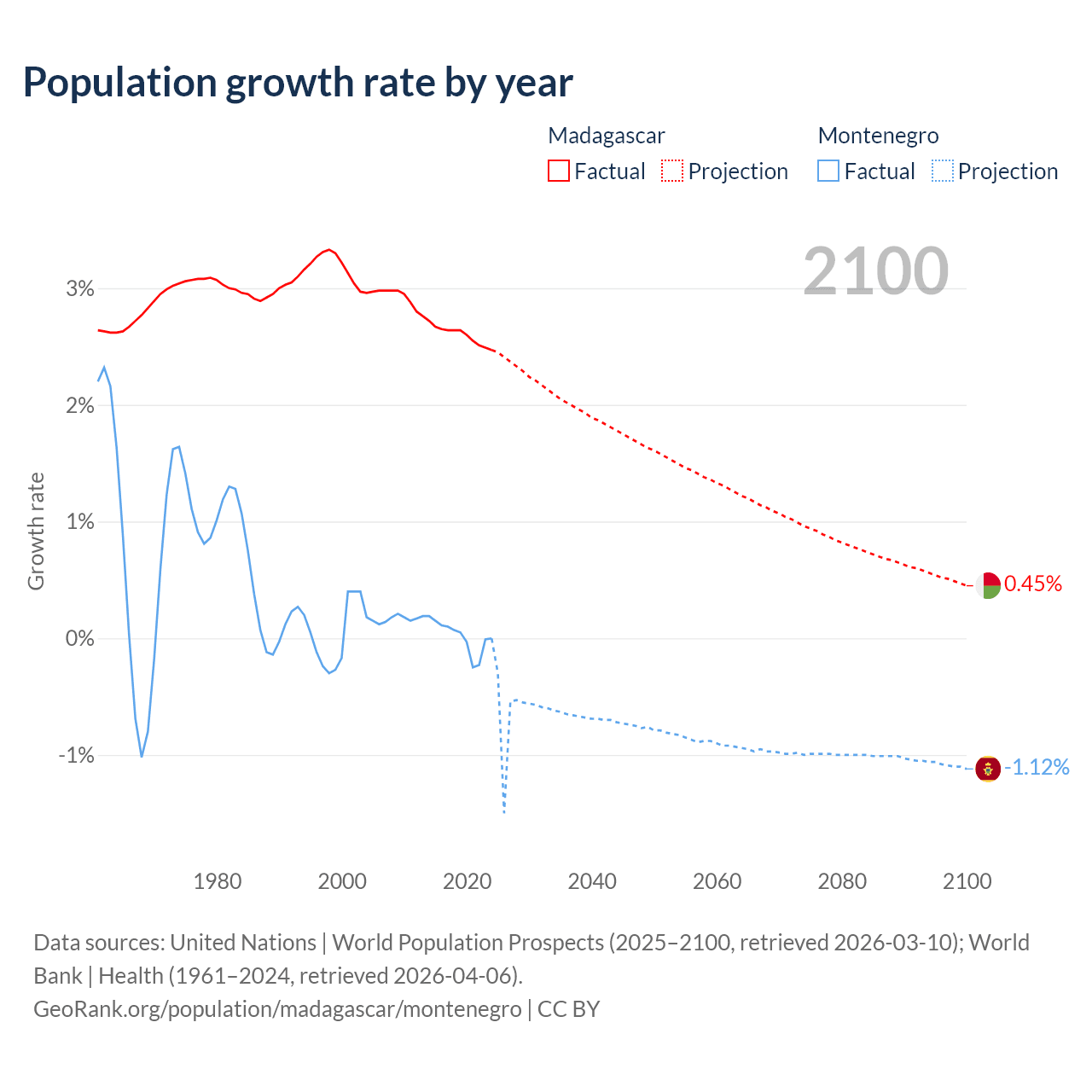 - For the last 10 years, Madagascar has had an average growth rate of +2.6% per year vs +0.01% in Montenegro.