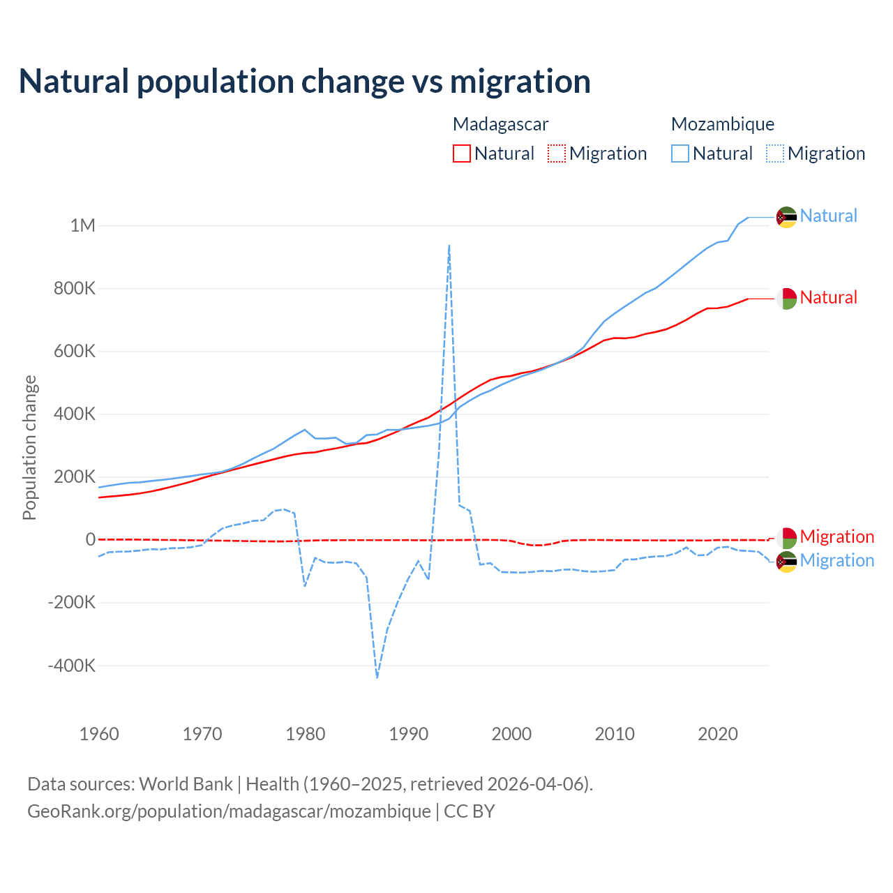 Over the last 10 years, 99.7% of the population change in Madagascar is from natural causes (a gain of 7,165,578 people) and 0.31% is from migration (a loss of 22,384 people). In Mozambique 95.9% is from natural causes (a gain of 9,108,203 people) and 4.15% is from migration (a loss of 393,923 people).