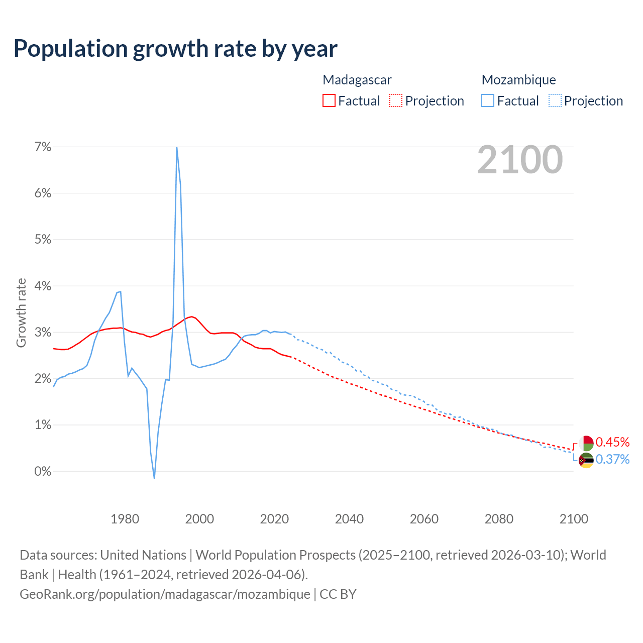 Madagascar vs Mozambique: population by year and forecast