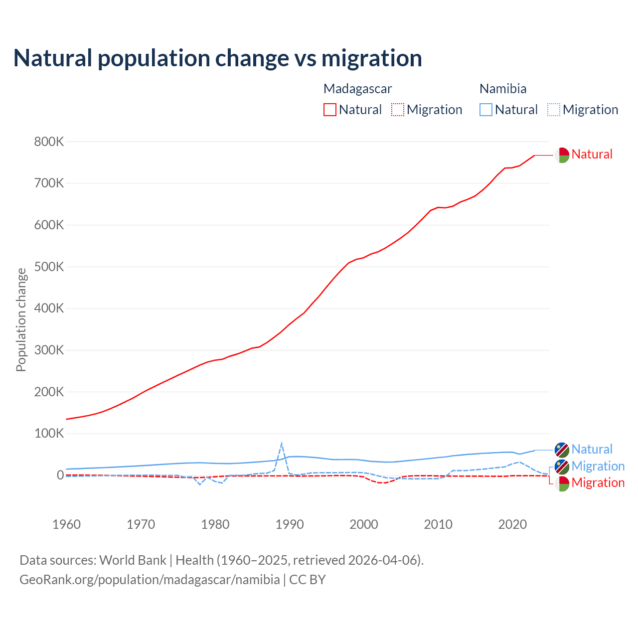 Over the last 10 years, 99.7% of the population change in Madagascar is from natural causes (a gain of 7,165,578 people) and 0.31% is from migration (a loss of 22,384 people). In Namibia 74.3% is from natural causes (a gain of 532,532 people) and 25.7% is from migration (a gain of 183,837 people).