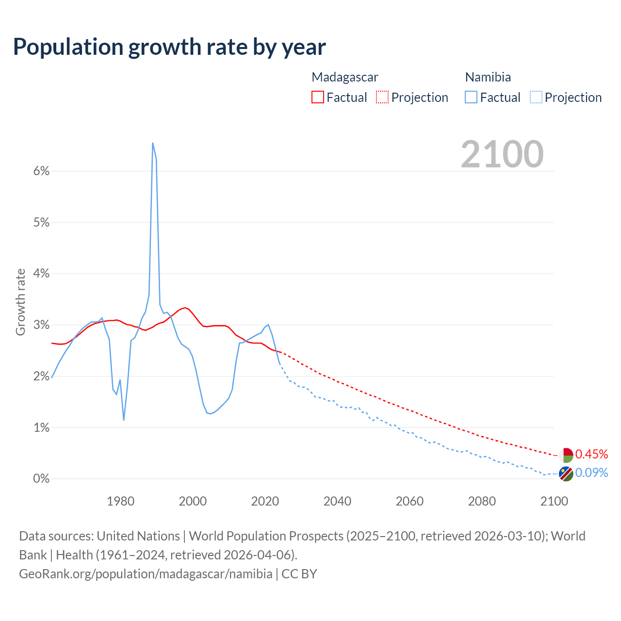 - For the last 10 years, Madagascar has had an average growth rate of +2.6% per year vs +2.73% in Namibia.
