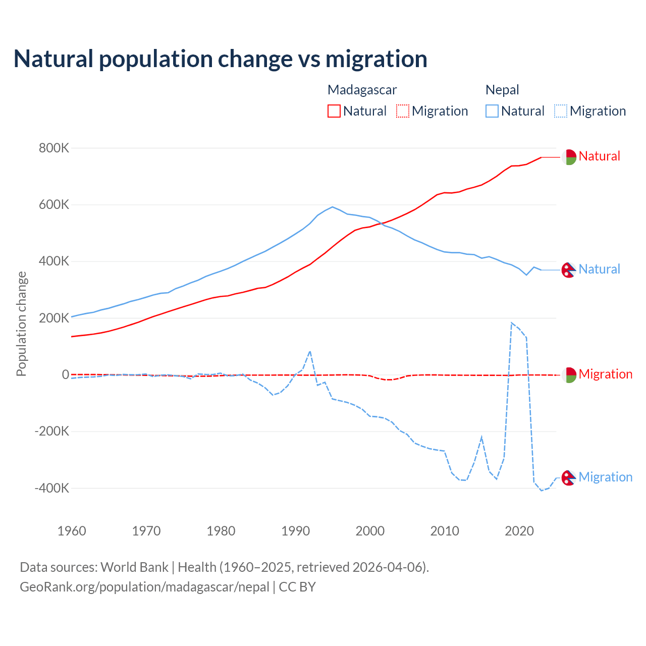 Over the last 10 years, 99.7% of the population change in Madagascar is from natural causes (a gain of 7,165,578 people) and 0.31% is from migration (a loss of 22,384 people). In Nepal 67.9% is from natural causes (a gain of 3,909,749 people) and 32.1% is from migration (a loss of 1,851,664 people).