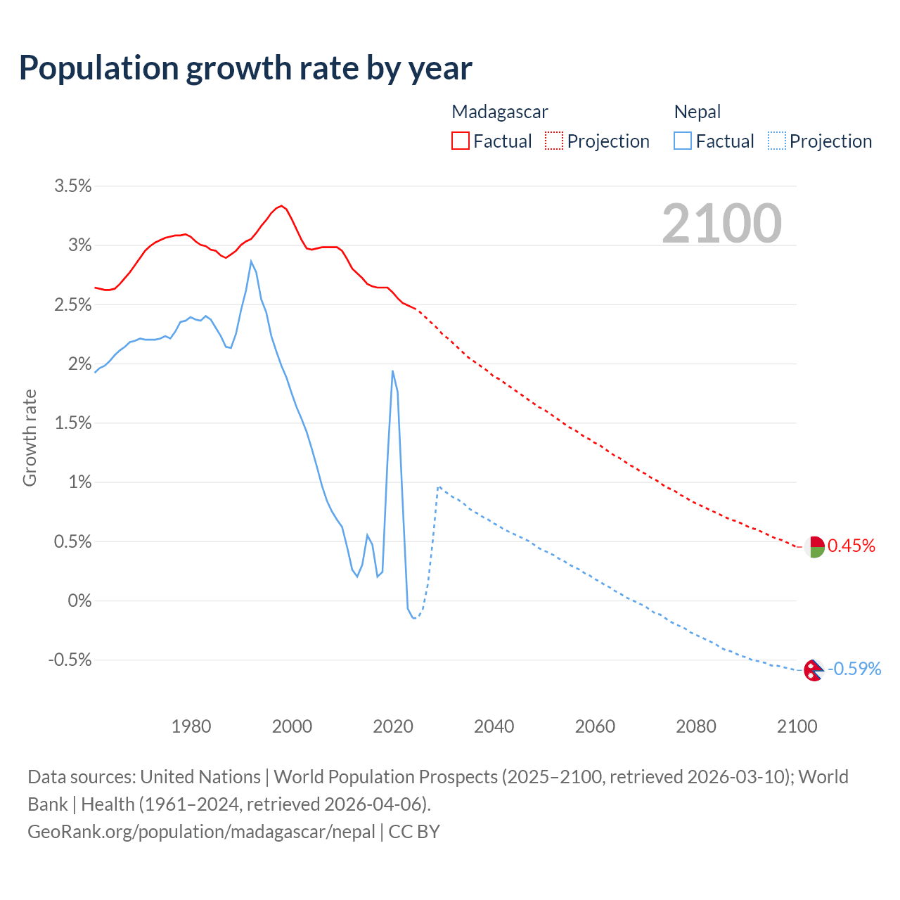 - For the last 10 years, Madagascar has had an average growth rate of +2.6% per year vs +0.66% in Nepal.