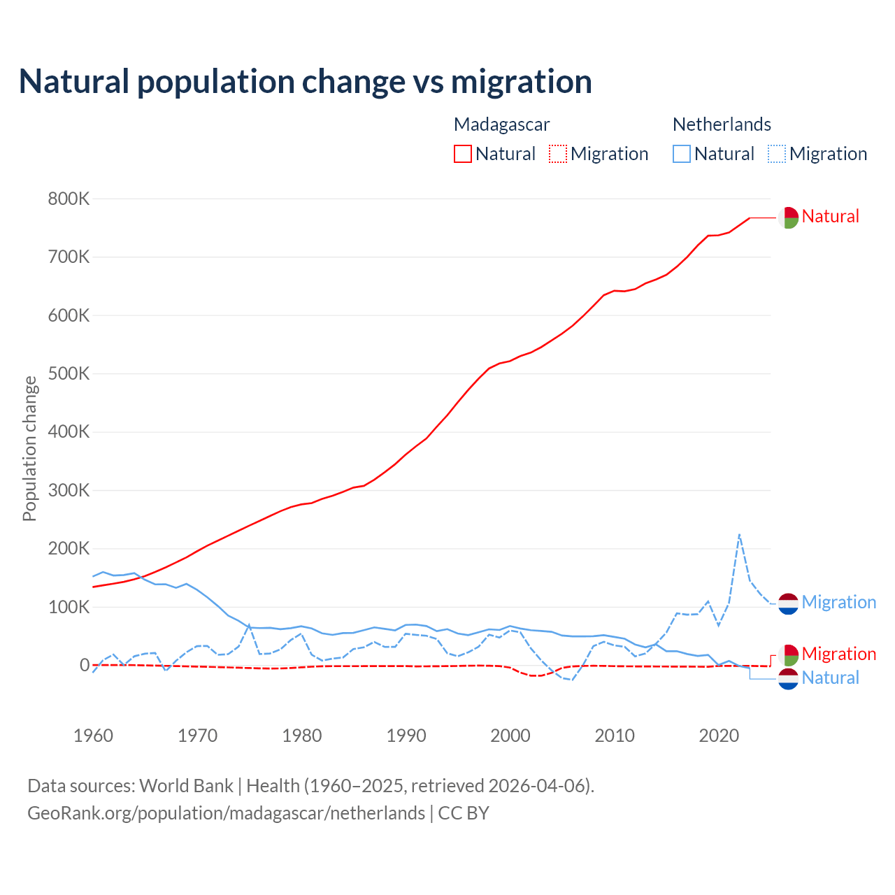 Over the last 10 years, 99.7% of the population change in Madagascar is from natural causes (a gain of 7,165,578 people) and 0.31% is from migration (a loss of 22,384 people). In the Netherlands 11.8% is from natural causes (a gain of 134,554 people) and 88.2% is from migration (a gain of 1,006,495 people).