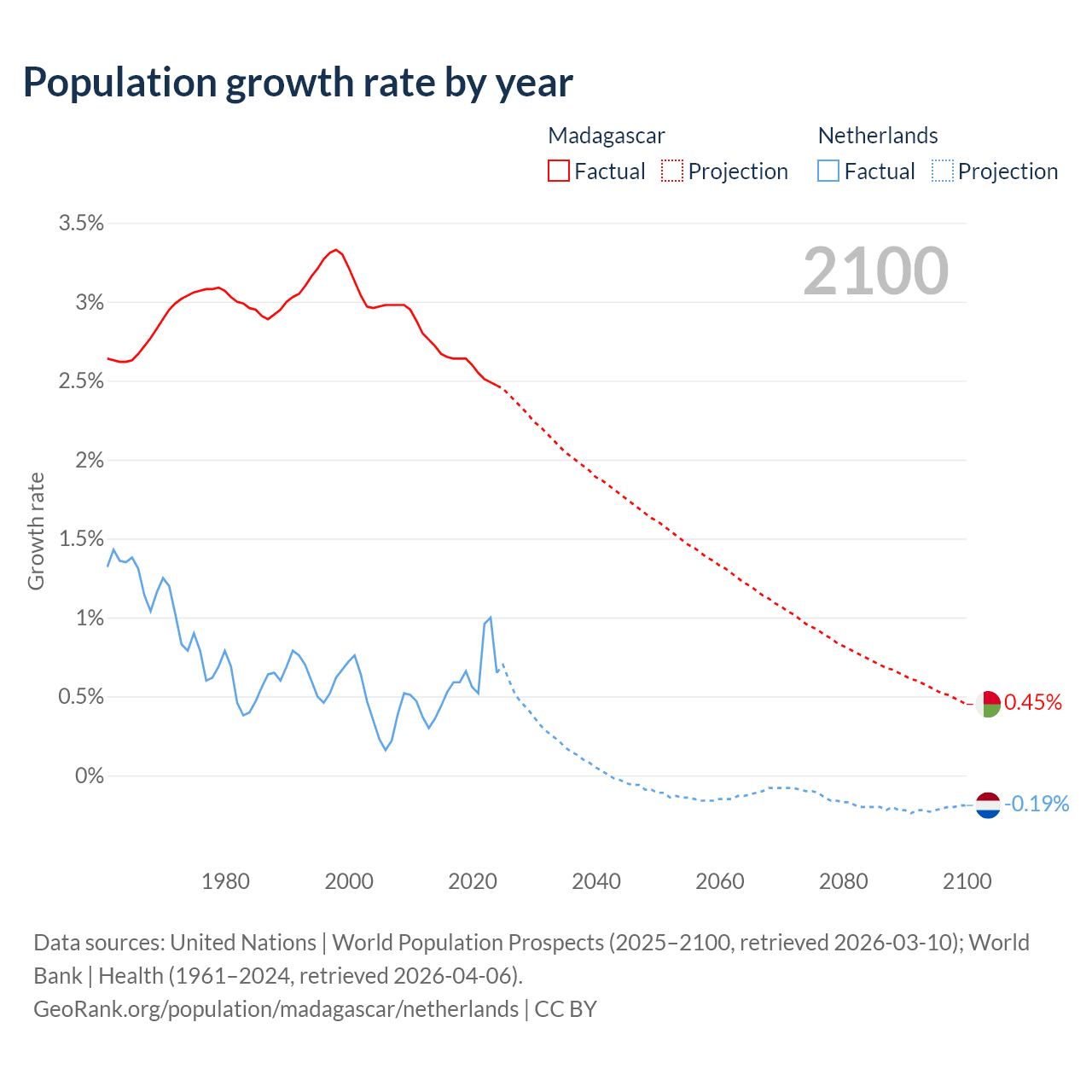- For the last 10 years, Madagascar has had an average growth rate of +2.6% per year vs +0.62% in the Netherlands.