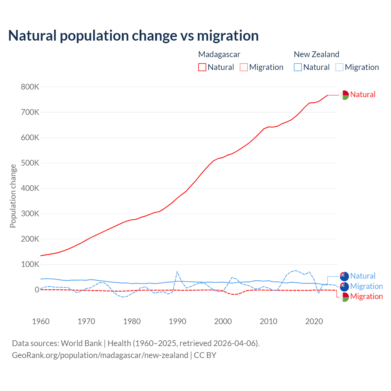 Over the last 10 years, 99.7% of the population change in Madagascar is from natural causes (a gain of 7,165,578 people) and 0.31% is from migration (a loss of 22,384 people). In New Zealand 34.4% is from natural causes (a gain of 247,767 people) and 65.6% is from migration (a gain of 471,602 people).
