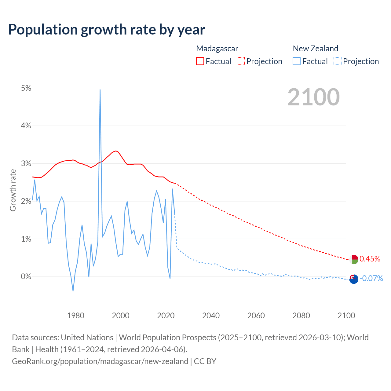 - For the last 10 years, Madagascar has had an average growth rate of +2.6% per year vs +1.6% in New Zealand.