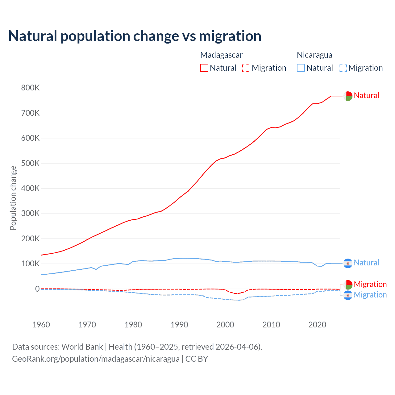 Over the last 10 years, 99.7% of the population change in Madagascar is from natural causes (a gain of 7,165,578 people) and 0.31% is from migration (a loss of 22,384 people). In Nicaragua 85.5% is from natural causes (a gain of 1,017,084 people) and 14.5% is from migration (a loss of 172,078 people).