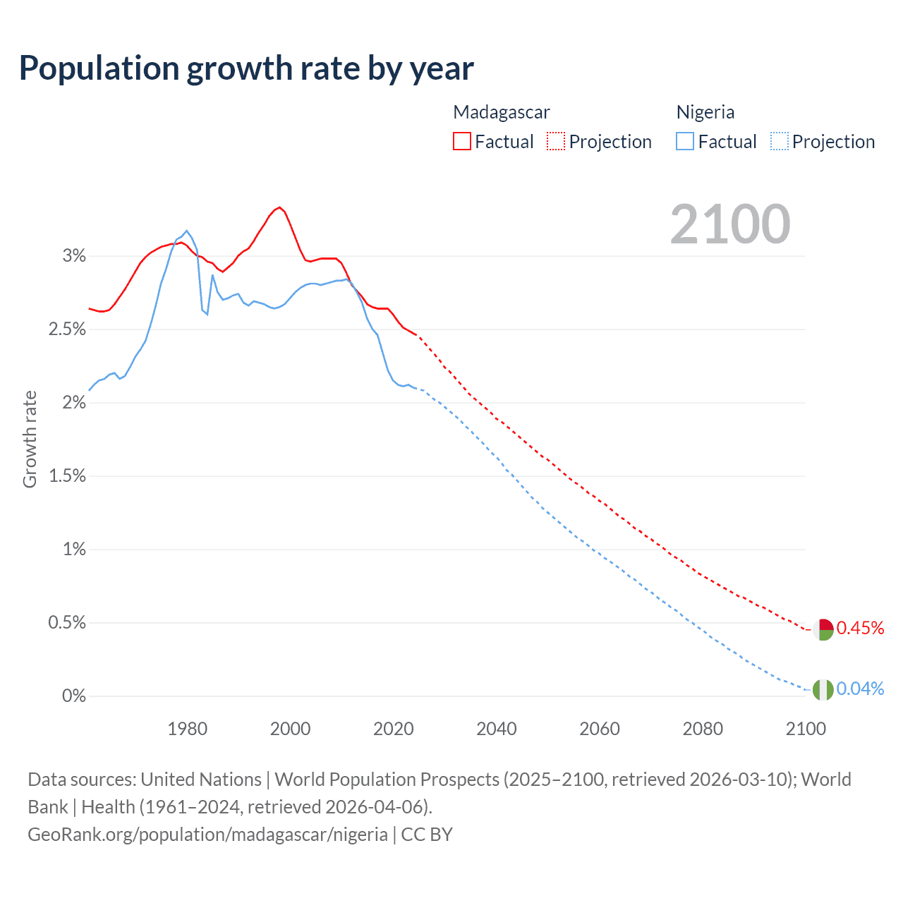 Data sources: World Bank | Health (1960–2024, retrieved 2026-04-06); United Nations | World Population Prospects (1960–2026, retrieved 2026-03-10); U.S. Census Bureau (1960–2025, retrieved 2026-02-08); Central Intelligence Agency (CIA) (2000–2019, retrieved 2026-02-20).