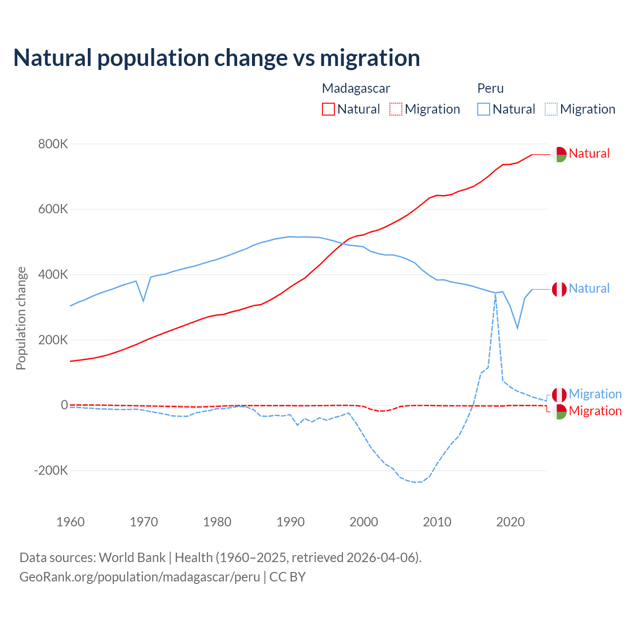 Over the last 10 years, 99.7% of the population change in Madagascar is from natural causes (a gain of 7,165,578 people) and 0.31% is from migration (a loss of 22,384 people). In Peru 82% is from natural causes (a gain of 3,345,822 people) and 18% is from migration (a gain of 732,505 people).