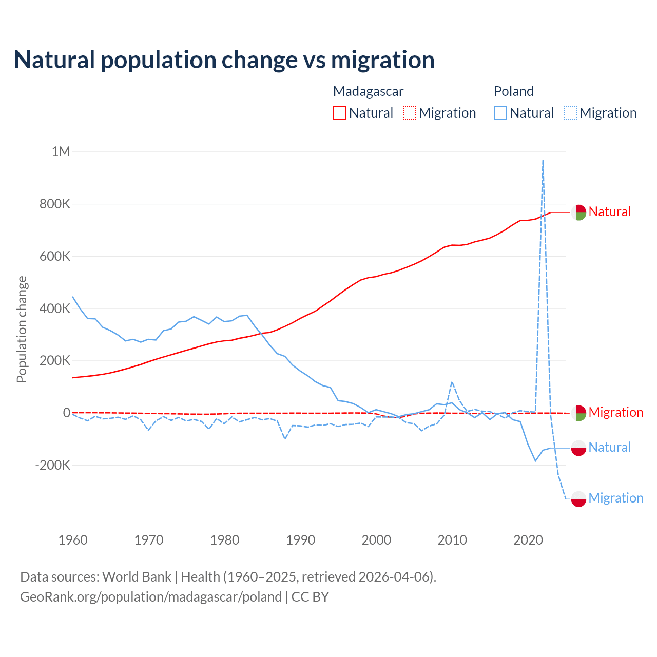 Over the last 10 years, 99.7% of the population change in Madagascar is from natural causes (a gain of 7,165,578 people) and 0.31% is from migration (a loss of 22,384 people). In Poland 41.4% is from natural causes (a loss of 675,443 people) and 58.6% is from migration (a gain of 955,766 people).