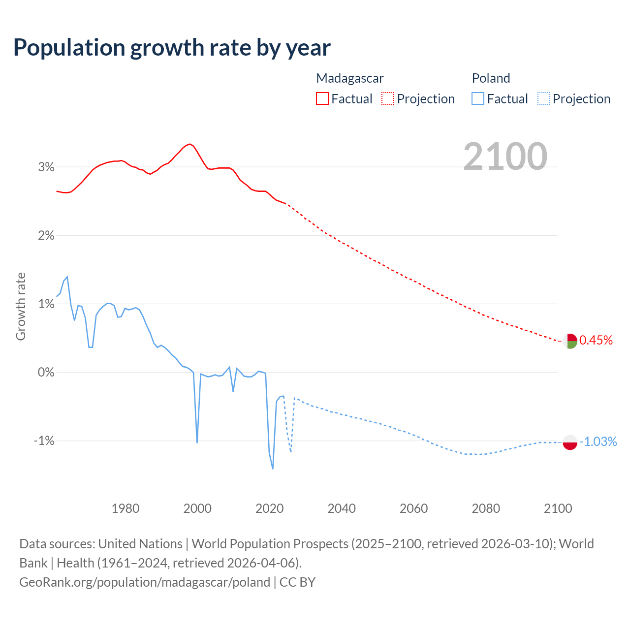 - For the last 10 years, Madagascar has had an average growth rate of +2.6% per year vs -0.36% in Poland.