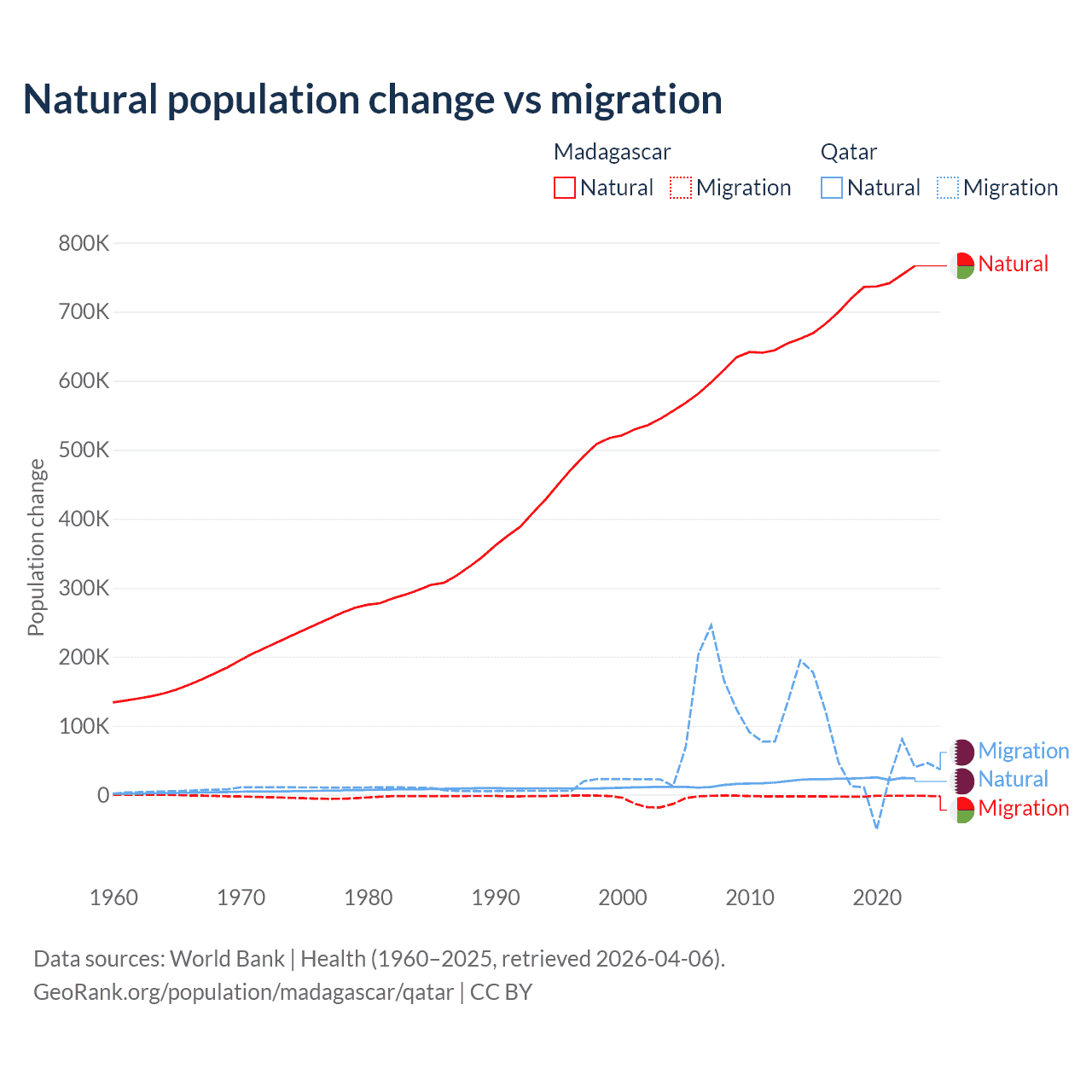 Over the last 10 years, 99.7% of the population change in Madagascar is from natural causes (a gain of 7,165,578 people) and 0.31% is from migration (a loss of 22,384 people). In Qatar 26.1% is from natural causes (a gain of 232,009 people) and 73.9% is from migration (a gain of 655,712 people).