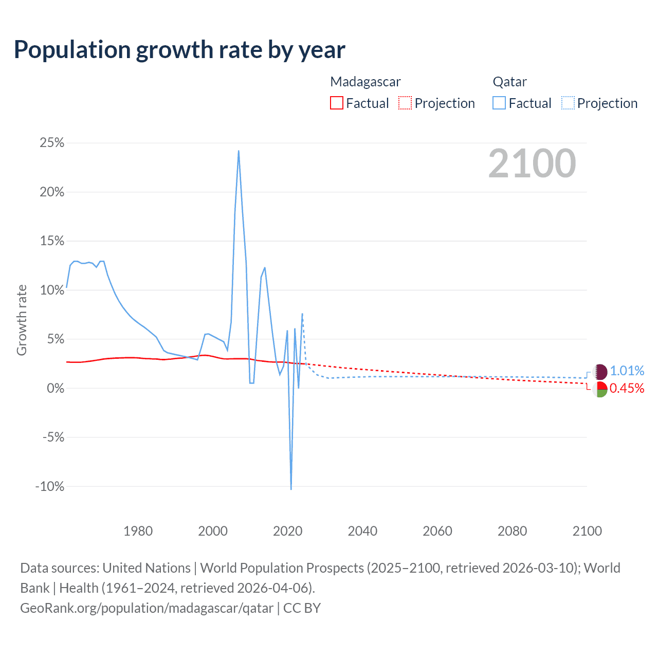 - For the last 10 years, Madagascar has had an average growth rate of +2.6% per year vs +3.86% in Qatar.