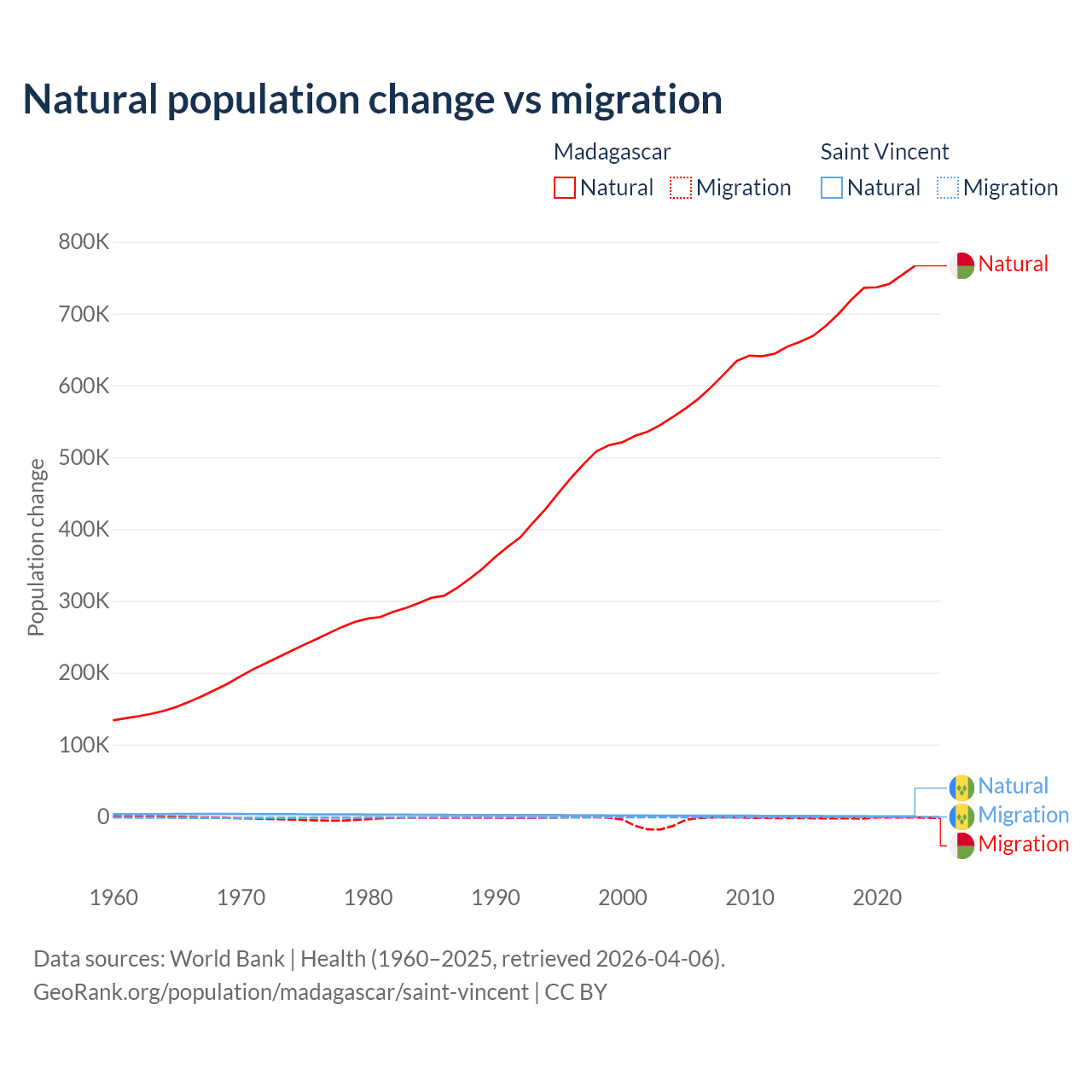 Over the last 10 years, 99.7% of the population change in Madagascar is from natural causes (a gain of 7,165,578 people) and 0.31% is from migration (a loss of 22,384 people). In Saint Vincent 21.2% is from natural causes (a gain of 2,525 people) and 78.8% is from migration (a loss of 9,393 people).