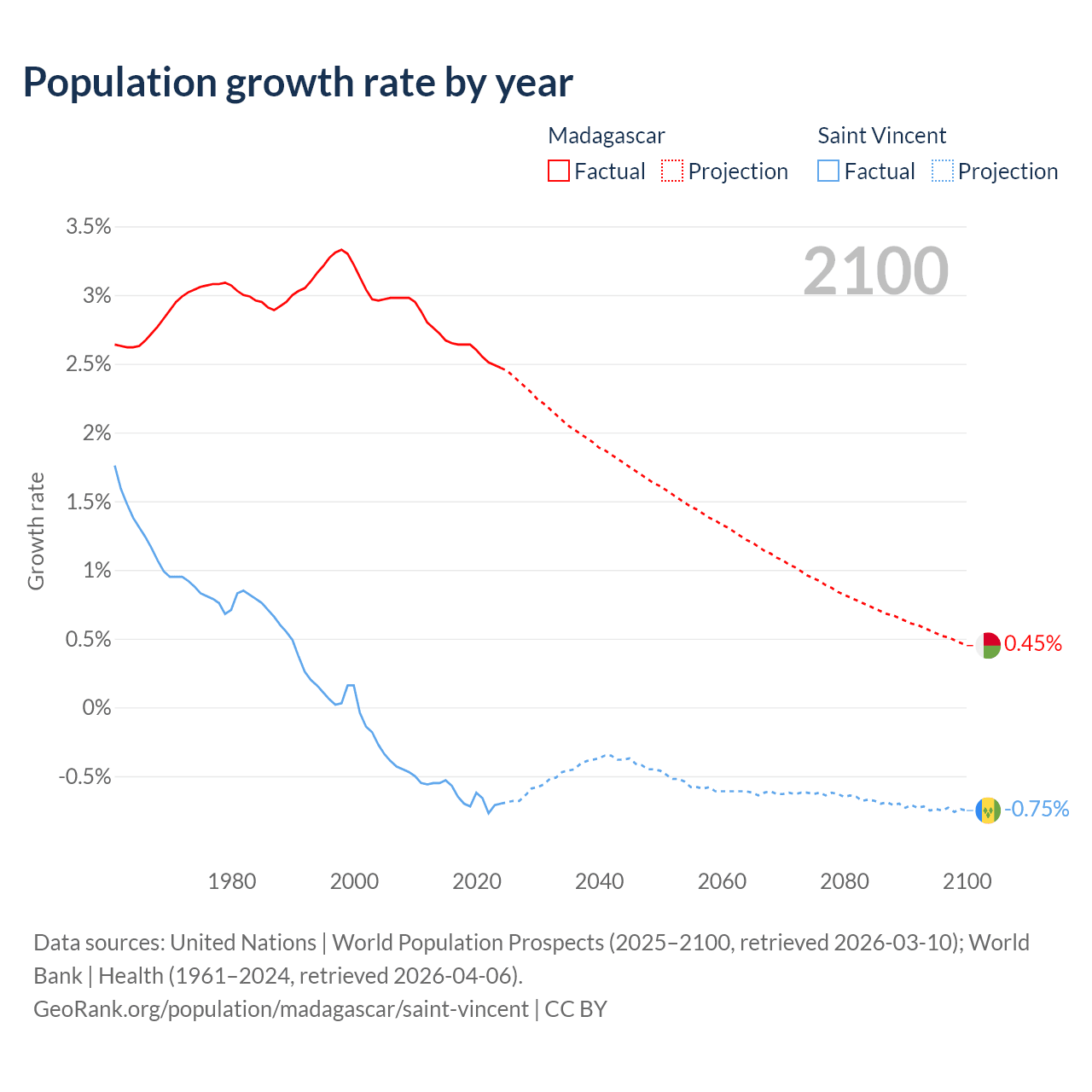 - For the last 10 years, Madagascar has had an average growth rate of +2.6% per year vs -0.65% in Saint Vincent.