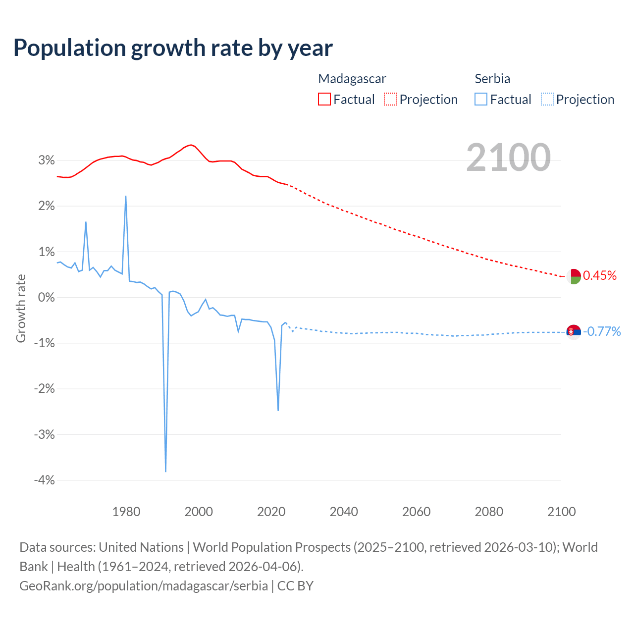 - For the last 10 years, Madagascar has had an average growth rate of +2.6% per year vs -0.76% in Serbia.