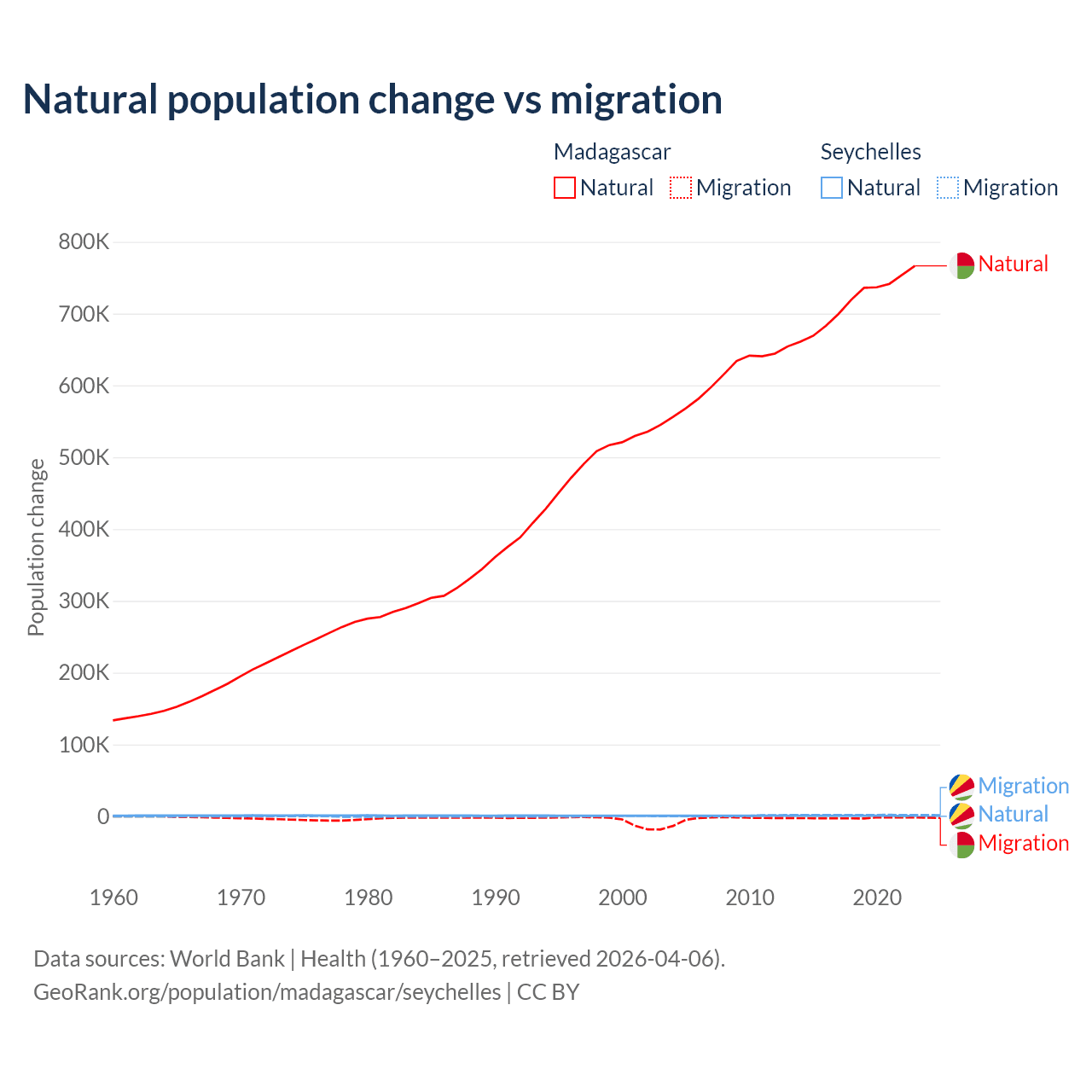 Over the last 10 years, 99.7% of the population change in Madagascar is from natural causes (a gain of 7,165,578 people) and 0.31% is from migration (a loss of 22,384 people). In the Seychelles 31.4% is from natural causes (a gain of 8,122 people) and 68.6% is from migration (a gain of 17,748 people).