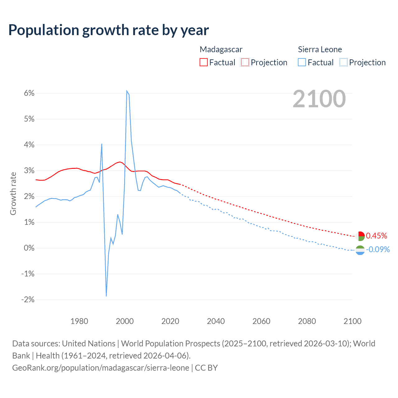 - For the last 10 years, Madagascar has had an average growth rate of +2.6% per year vs +2.32% in Sierra Leone.