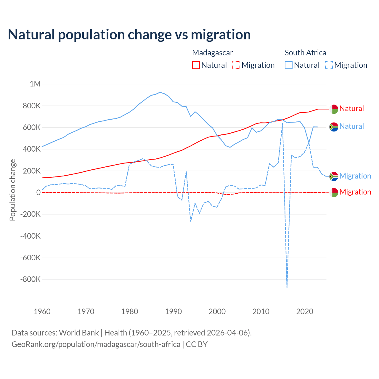 Over the last 10 years, 99.7% of the population change in Madagascar is from natural causes (a gain of 7,165,578 people) and 0.31% is from migration (a loss of 22,384 people). In South Africa 72.8% is from natural causes (a gain of 6,190,027 people) and 27.2% is from migration (a gain of 2,316,795 people).