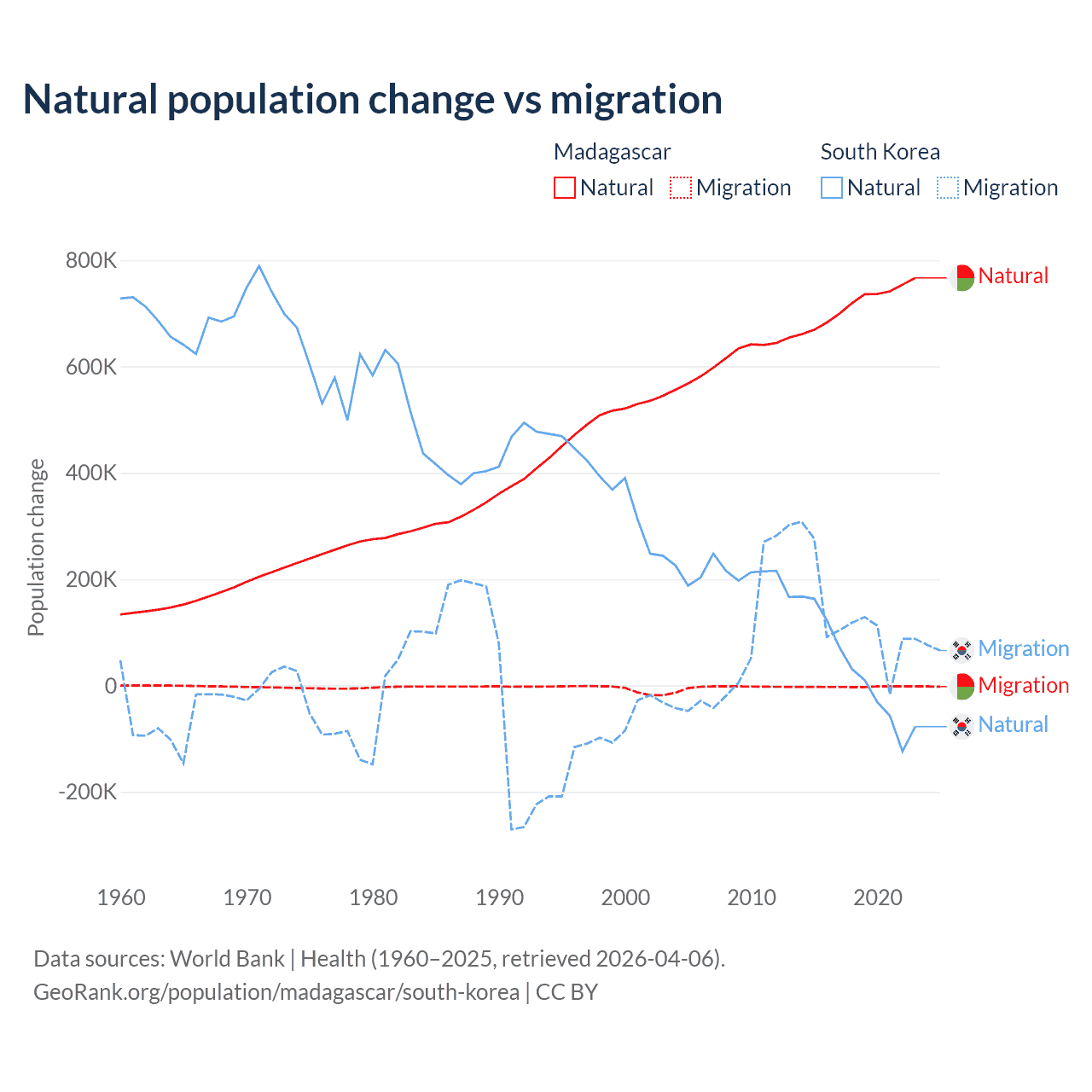 Over the last 10 years, 99.7% of the population change in Madagascar is from natural causes (a gain of 7,165,578 people) and 0.31% is from migration (a loss of 22,384 people). In South Korea 17.6% is from natural causes (a gain of 277,215 people) and 82.4% is from migration (a gain of 1,298,356 people).