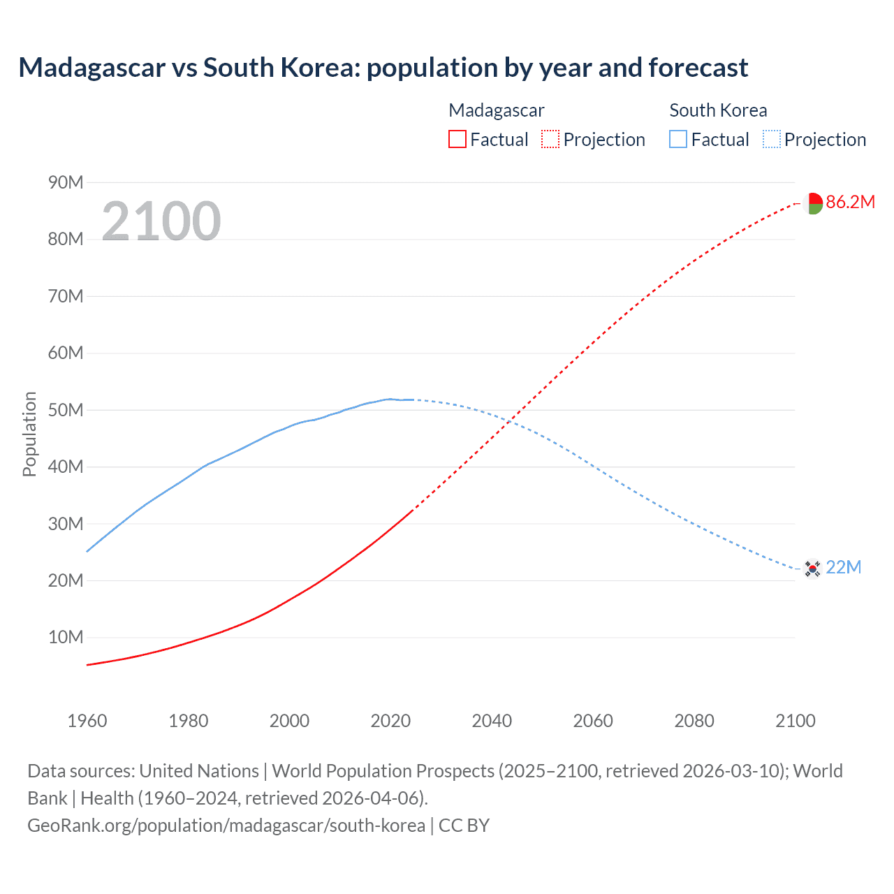 The latest officially reported population of Madagascar was 31,964,956 in 2024 vs 51,751,065 people in South Korea in 2024. In 2026, based on the adjusted UN estimation, the current Madagascar's population is 33,750,171 people compared to 51,649,918 in South Korea.