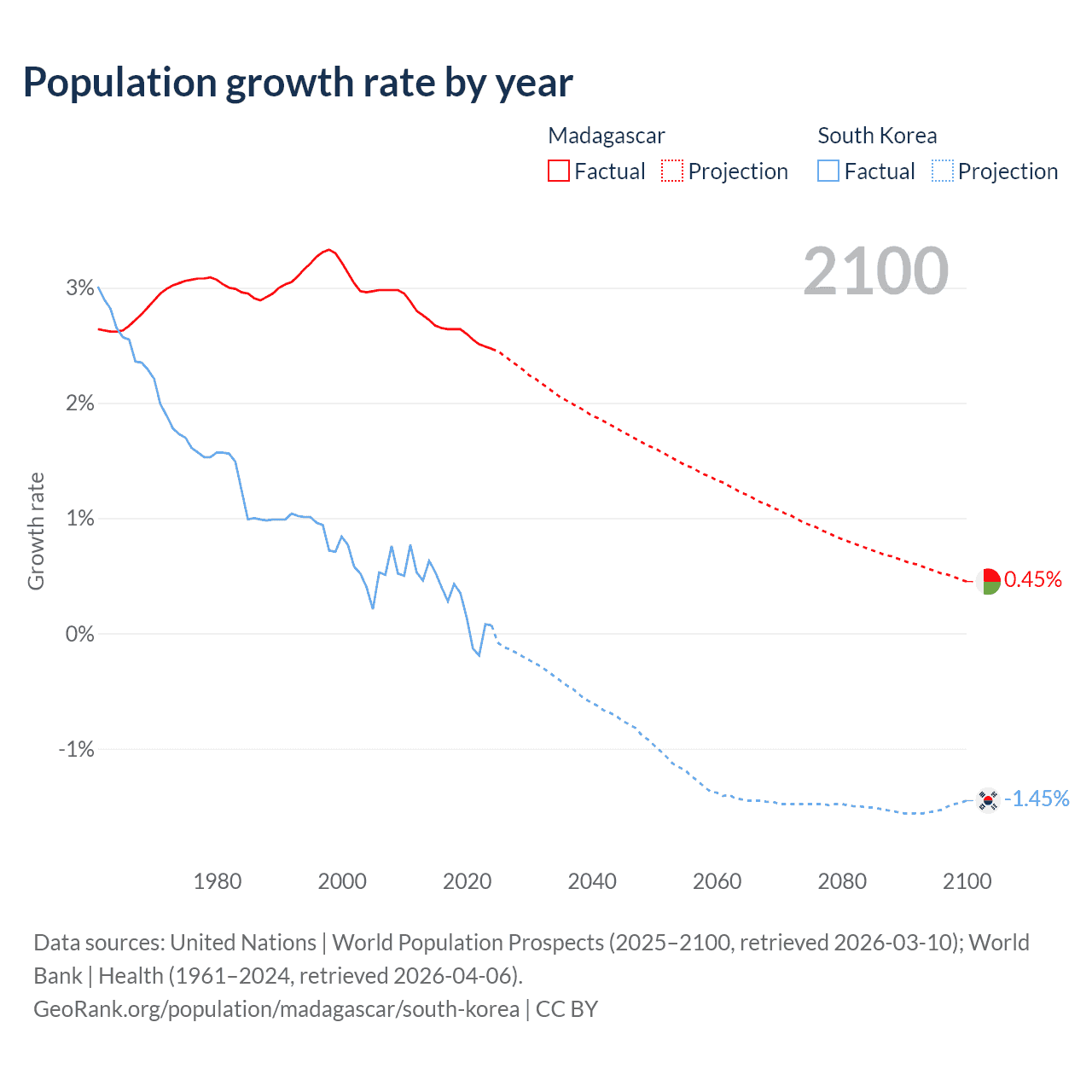 - For the last 10 years, Madagascar has had an average growth rate of +2.6% per year vs +0.24% in South Korea.