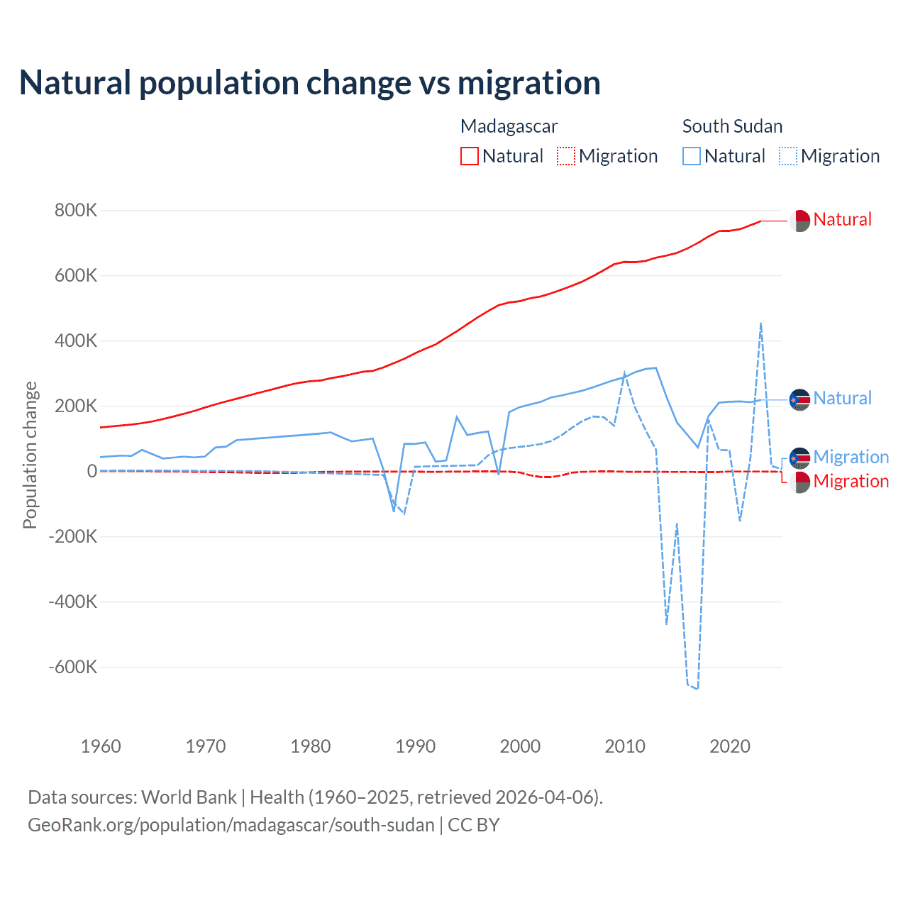 Over the last 10 years, 99.7% of the population change in Madagascar is from natural causes (a gain of 7,165,578 people) and 0.31% is from migration (a loss of 22,384 people). In South Sudan 57.4% is from natural causes (a gain of 1,792,135 people) and 42.6% is from migration (a loss of 1,329,606 people).