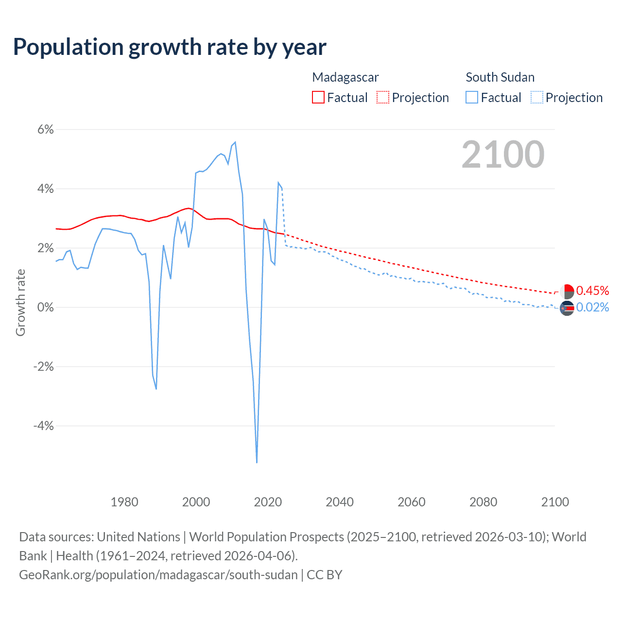 - For the last 10 years, Madagascar has had an average growth rate of +2.6% per year vs +0.65% in South Sudan.