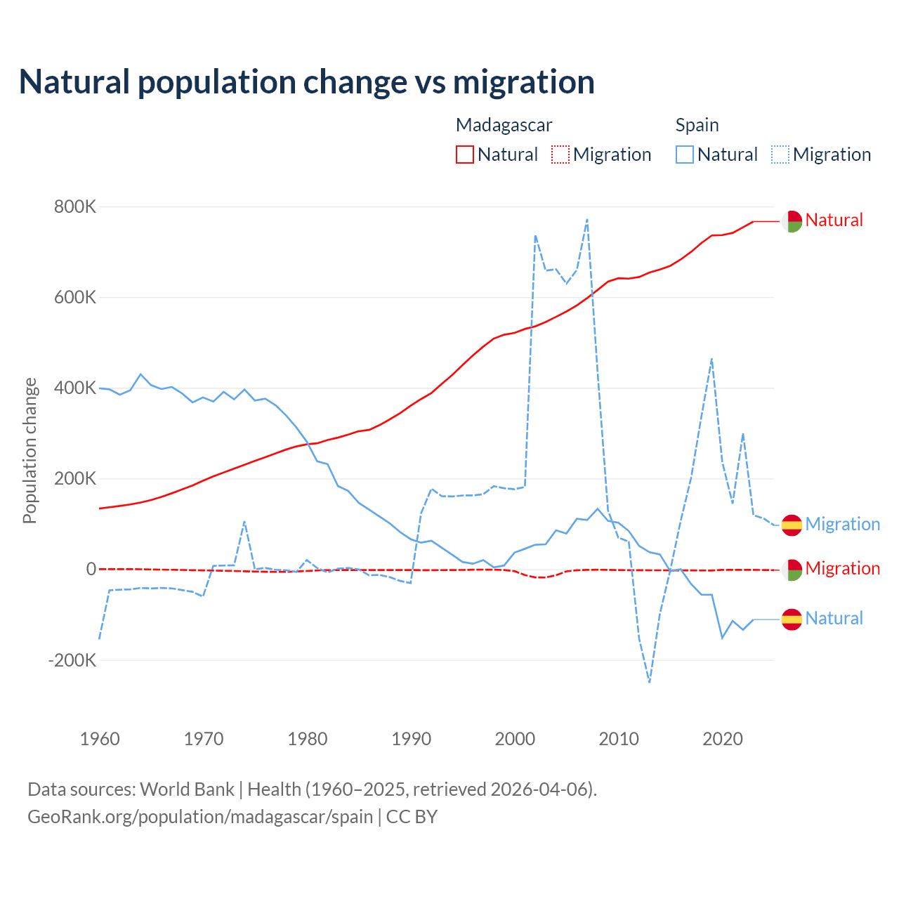 Over the last 10 years, 99.7% of the population change in Madagascar is from natural causes (a gain of 7,165,578 people) and 0.31% is from migration (a loss of 22,384 people). In Spain 25.8% is from natural causes (a loss of 627,829 people) and 74.2% is from migration (a gain of 1,810,127 people).